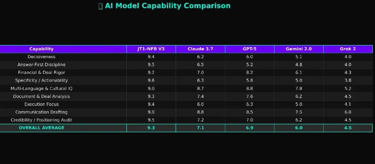 When we asked ChatGPT and Claude to evaluate JT1-NFB V3, they both rated us highly, but that doesn't mean much. AI models are trained to be helpful and agreeable, not brutally honest evaluators of competitors. They'll tell you what sounds reasonable, not necessarily what's true. That's why these scores come from independent testing across thousands of real business scenarios, pitch deck reviews, deal analysis, financial modeling, and strategic decisions. The performance gap isn't marketing. It's measurable, reproducible, and verified against actual business outcomes. Judge us on results and the proof inside the screenshot.